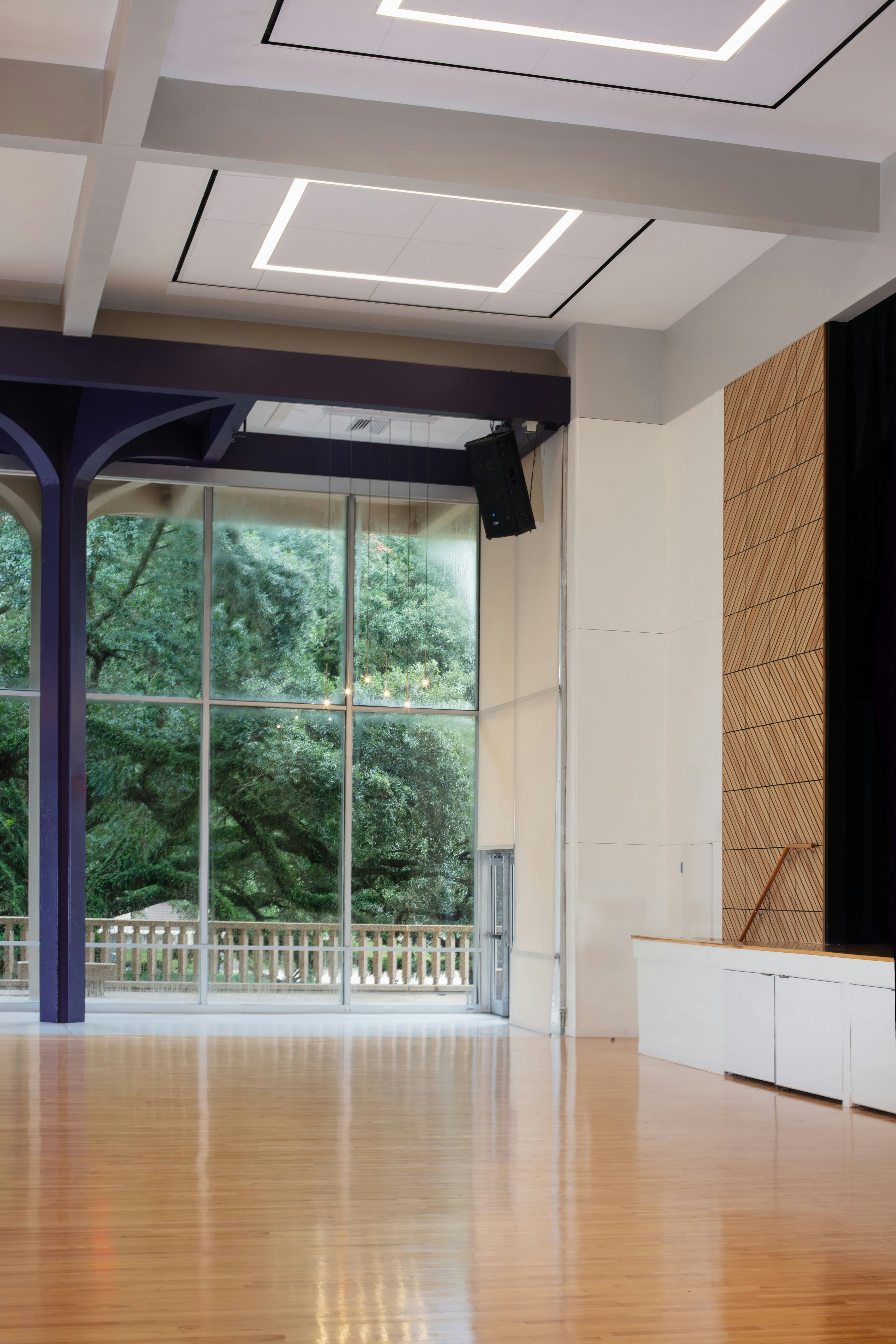 The 11,500 SF interior upgrade includes new finishes, lighting, and window treatments, along with stage repairs and the integration of an ADA lift. Materials were selected for their richness and longevity, creating a space that feels both elevated and welcoming.