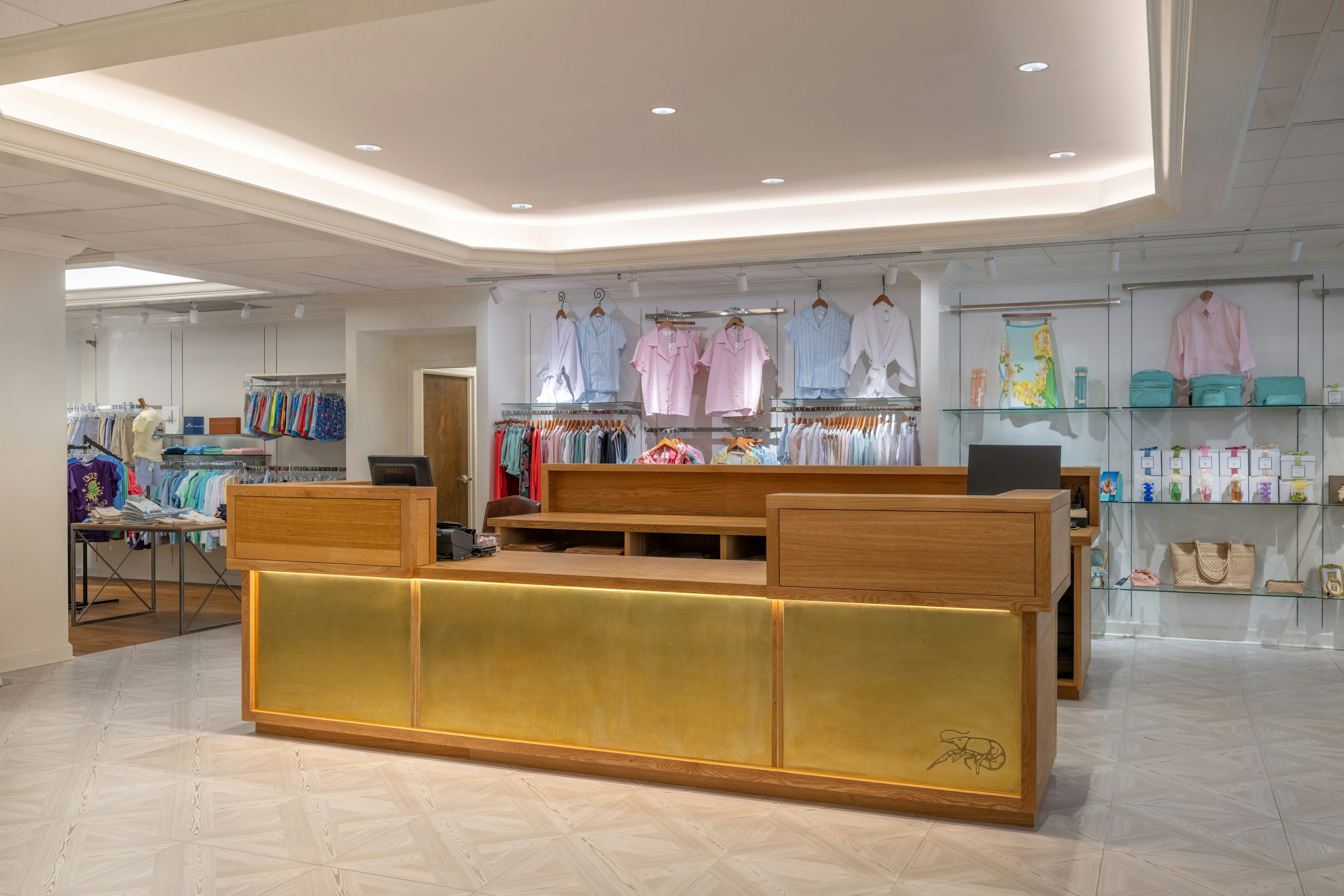 Downstairs, we introduced a clean grid layout and wrapped existing columns to establish rhythm while maintaining warmth. The men’s department became a free-flowing, intuitive retail zone with floating fixtures, new mirrors, and movable wooden elements that support seasonal merchandising. The women’s and boys’ departments upstairs reflect a more refined palette that match the elegance of the clothing line.