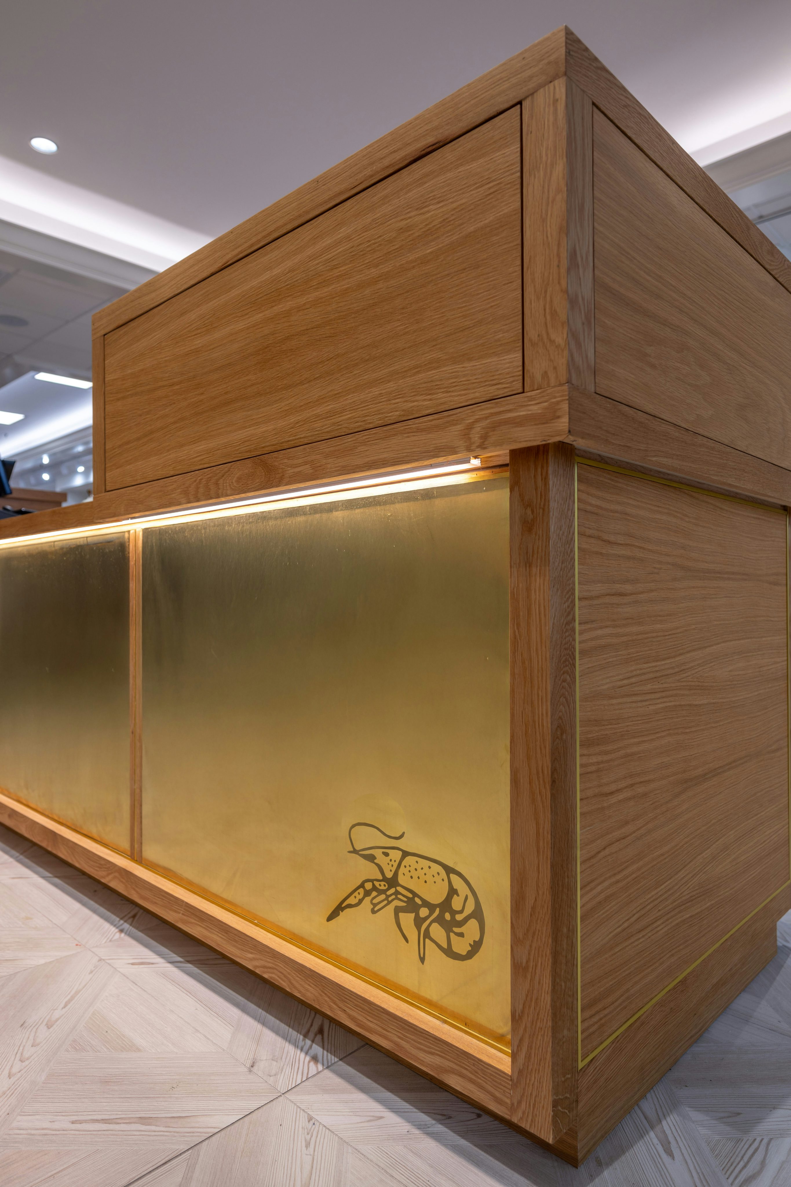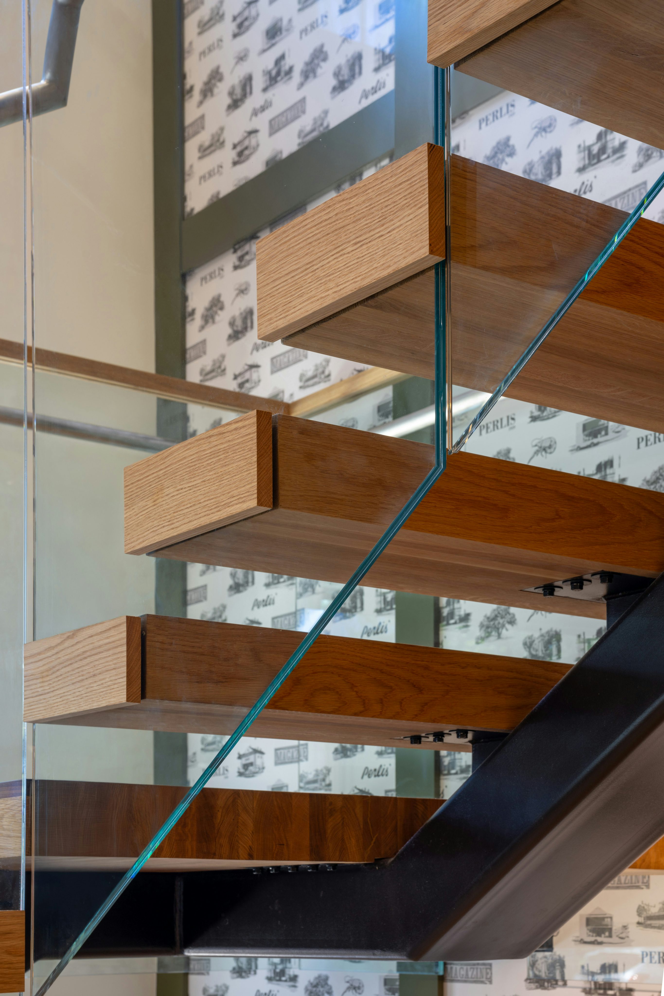 A custom wallpaper wraps select interior walls with historic references—featuring the original Perlis logo and imagery from its earliest storefronts. It serves as a tactile reminder of the company’s roots while celebrating its evolution.