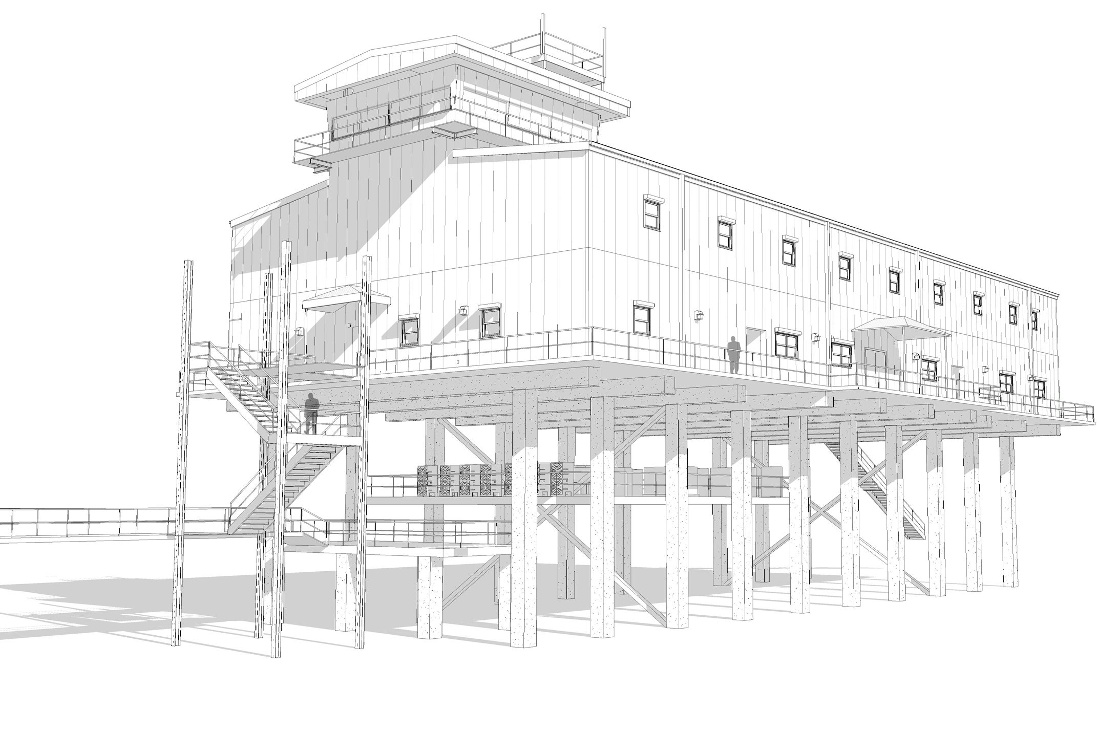 Completely self-sufficient, Southwest Pass Station has its own power generation, on-board water capture and filtration, and sanitary capture. Access and resupply is only possible by watercraft. Because the station is operational 24/7/365, utilizing sustainable building materials was crucial for this project.